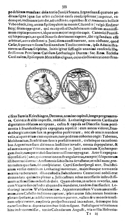Description: A depiction of two coins. The left coin shows a profile of Cardinal Carolus Argent and the right coin shows a coat of arms topped by a cross and surrounded by rope tassels.