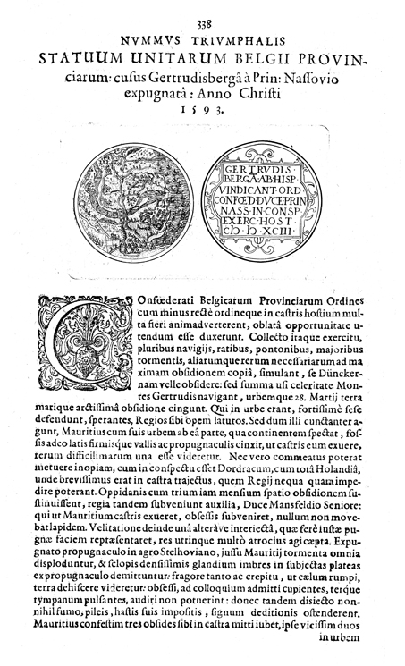 Description: A depiction of two coins. The left coin shows an aerial map of a city and a port and the right coin shows an inscription of the year 1593.