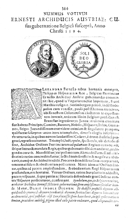 Description: A depiction of six coins. The top left coin shows a profile of Henricus IIII, King of France. The top right coin shows a depiction of the goddess of virtue holding a palm branch and an olive wreath with a caudecus at her feet. The center left coin shows a smaller profile of Henricus IIII, King of France. The center right coin shows a depiction of three crossed swords, each topped by a crown. The lower left coin shows a profile of Henricus IIII, and the lower right coin shows a depiction of a columned arch with angels on the top.