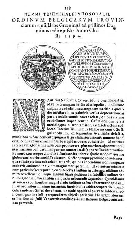 Description: A depiction of two coins. The left coin shows a depiction of a tree within an olive wreath. The right coin shows a profile of Mauritius Praurco.