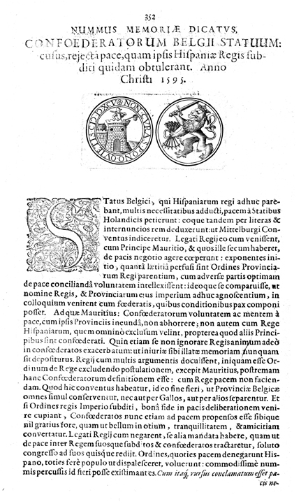 Description: A depiction of two coins. The left coin shows a portrait of Prince Carolus Mansfeldius and the right coin shows a depiction of two cornucopia beneath a crown.