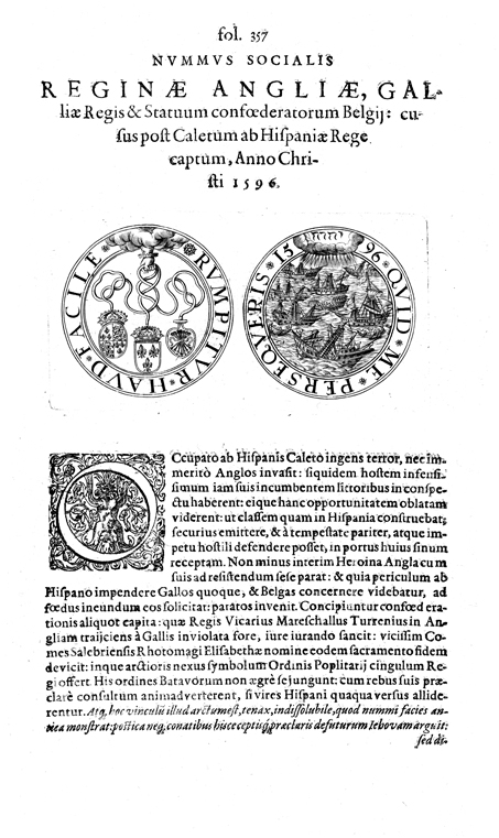 Description: A depiction of two coins. The left coin shows three coats of arms connected by rope to a hand descending from the clouds. The right coin shows a depiction of boats at sea beneath sunlight with the Tetragrammaton.