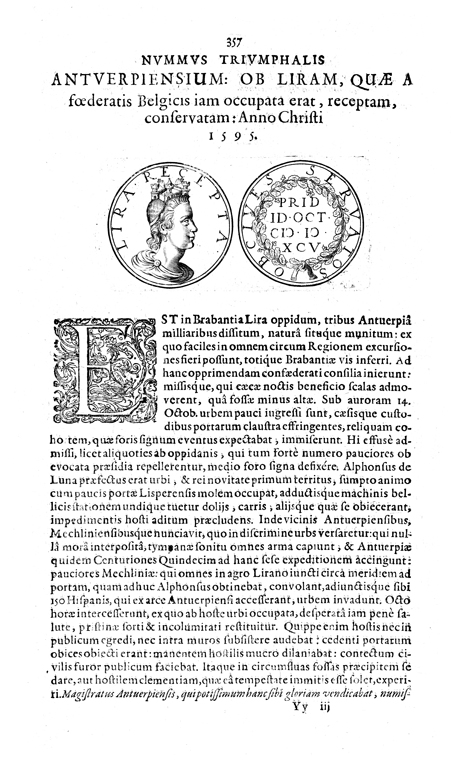 Description: A depiction of two coins. The left coin shows a depiction of a woman with a city on her head, and the right coin shows an inscription of the year 1595 within an olive wreath.