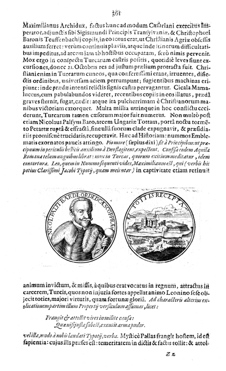 Description: A depiction of two coins. The left coin shows a portrait of Nicholas Palfi and the right coin shows a depiction of a walled city.