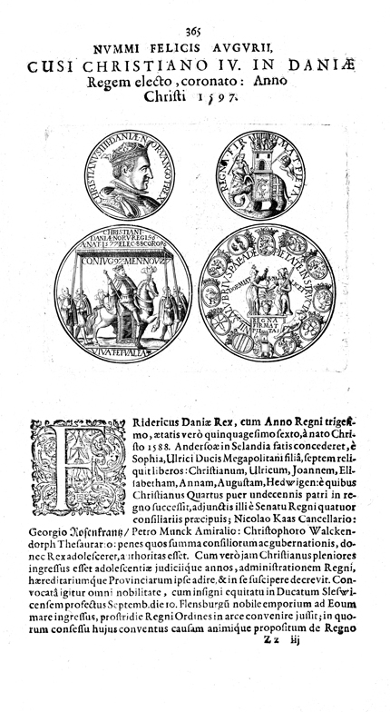 Description: A depiction of four coins. The top left coin shows a profile of King Christianus IIII. The top right coin shows a depiction of a group of soldiers on top of an elephant. The lower left coin shows a depiction of a King riding a horse beneath a canopy. The lower right coin shows eleven coats of arms arranged in a circle around a soldier and a woman grasping a plant in the center.