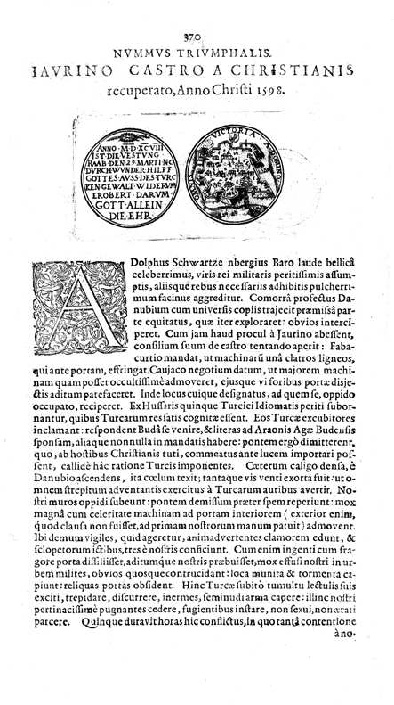 Description: A depiction of two coins. The left coin has an inscription of the year 1598 and the right coin shows a depiction of an aerial view of a walled city.