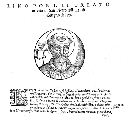 Description: An image of Linus, traditionally held to be the second Pope of the Roman Catholic Church and Bishop of Rome (r. 67-79 CE). He wears a pallium and is depicted with a nimbus; to the left is a blank coat of arms with the papal triple tiara on above.