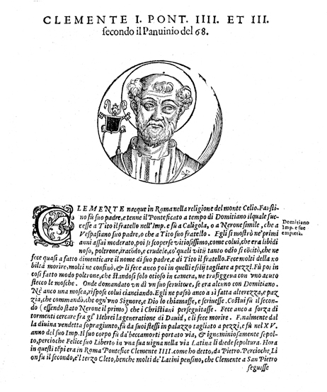 Description: An image of Clement I, also known as Clement of Rome, Pope of the Roman Catholic Church and Bishop of Rome (r. 88-101 CE). He wears a pallium and is depicted with a nimbus; to the left is a blank coat of arms with the papal triple tiara on above.
