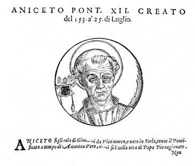 Description: An image of Anicetus, Pope of the Roman Catholic Church and the Bishop of Rome (r. 154-167 CE). He wears a pallium and is depicted with a nimbus; to the left is a blank coat of arms with the papal triple tiara above.