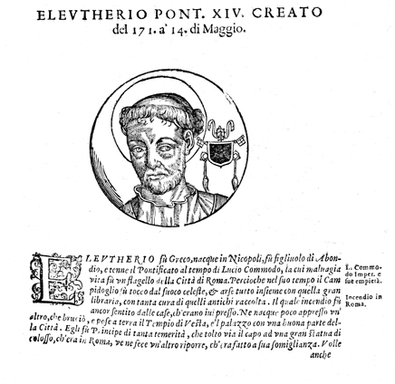 Description: An image of Eleuterus, or Eleutherius, Pope of the Roman Catholic Church and the Bishop of Rome (r. 175-189 CE). He wears a pallium and is depicted with a nimbus; to the right is a blank coat of arms with the papal triple tiara above.