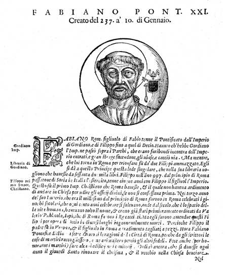 Description: An image of Fabian, Pope of the Roman Catholic Church and the Bishop of Rome (r. 236-250 CE). He wears a pallium and is depicted with a nimbus; to the right is a blank coat of arms with the papal triple tiara above.