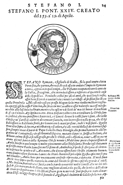 Description: An image of Stephen I, Pope of the Roman Catholic Church and the Bishop of Rome (r. 254-257CE). He is depicted with a nimbus; to the left is a blank coat of arms with the papal triple tiara above.