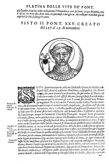 [Historia delle vite de sommi pontefici : dal Salvator Nostro sino a Gregorio XV / Scitta già da Battista Platina Cremonese ; dal P.F. Onofrio Panvinio da Verona, da Antonio Cicarelli da Foligno e da D. Giovanni Stringa Venetiano. Et hora ampliata dal M.R.P.F. Abramo Bzovio, Maestro di Theologia dell'ordine de Predicatori delle vite di Paolo V & di Greg. XV. Illustrata con le Annotationi del Panvinio, nelle vie descritte dal Platina, e con la Cronologia Ecclesiastica dell'istesso, tradotta in lingua Italiana & ampliata dal R.M. Bartolomeo Dionigi da Fano, da D. Lauro Testa, e dal detto P.F. Abramo Bzovio. Ornata nuovamente di bellissimi ritratti di tutti i Pontefici al naturale. Arrichita con'nomi, cognomi, patrie et titoli di tutti quei Cardinali de quali s'è potuto haver cognitione, raccolti per il sudetto Dionigi dall'opere del Panvinio e da gli arti della Cancellaria Apostolica.]