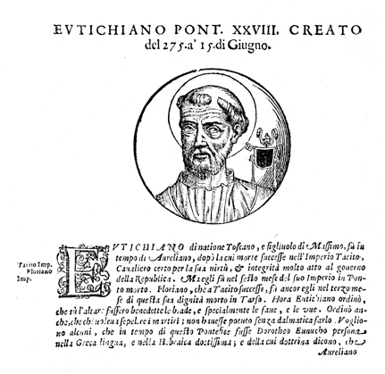 Description: An image of Eutychian, or Eutychianus, Pope of the Roman Catholic Church and the Bishop of Rome (r. 275-283 CE). He wears a pallium and is depicted with a nimbus; to the right is a blank coat of arms with the papal triple tiara above.