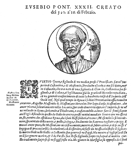 Description: An image of Eusebius, Pope of the Roman Catholic Church and the Bishop of Rome (r. 309-310 CE). He wears a pallium and is depicted with a nimbus; to the right is a blank coat of arms with the papal triple tiara above.