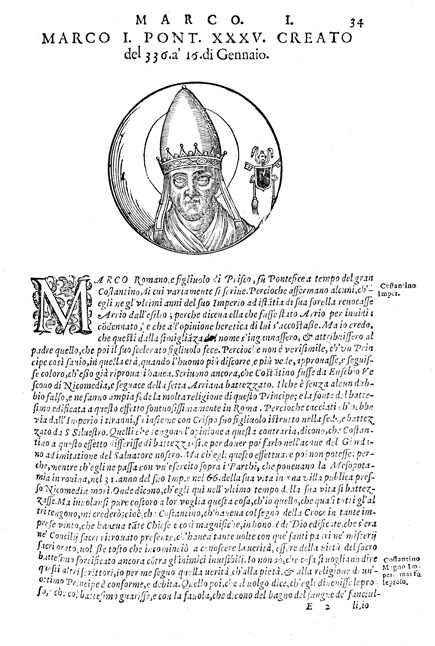 Description: An image of Pope Mark, or Marcus, Pope of the Roman Catholic Church and the Bishop of Rome (r. 336 CE). He wears a pallium and is depicted with a nimbus; to the right is a blank coat of arms with the papal triple tiara above.