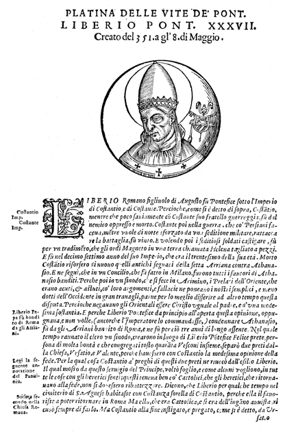 Description: An image of Pope Liberius, Pope of the Roman Catholic Church and the Bishop of Rome (r. 352-366 CE). He wears a pallium and is depicted with a nimbus; to the left is a coat of arms with the papal triple tiara above.