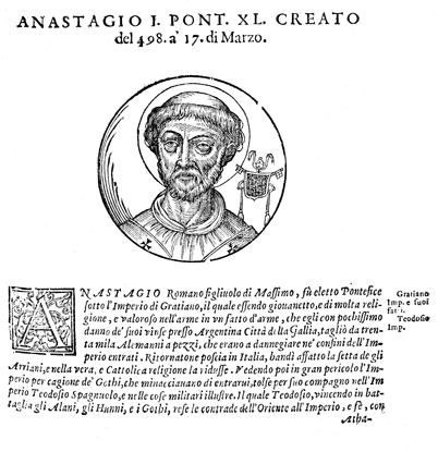 Description: An image of Pope Anastasius I, Pope of the Roman Catholic Church and the Bishop of Rome (r. 399-401 CE). He wears a pallium and is depicted with a nimbus; to the right is a blank coat of arms with the papal triple tiara above.