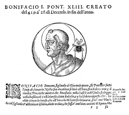 Description: An image of Pope Boniface I, Pope of the Roman Catholic Church and the Bishop of Rome (r. 418-422 CE). He wears a pallium and is depicted with a nimbus; to the right is a blank coat of arms with the papal triple tiara above.