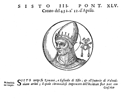 Description: An image of Pope Sixtus III, Pope of the Roman Catholic Church and the Bishop of Rome (r. 432-440 CE). He wears a pallium and is depicted with a nimbus; to the right is a blank coat of arms with the papal triple tiara above.
