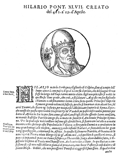 Description: An image of Hilarius, Pope of the Roman Catholic Church and the Bishop of Rome (r. 461-468 CE). He wears a pallium and is depicted with a nimbus; to the left is a blank coat of arms with the papal triple tiara above.