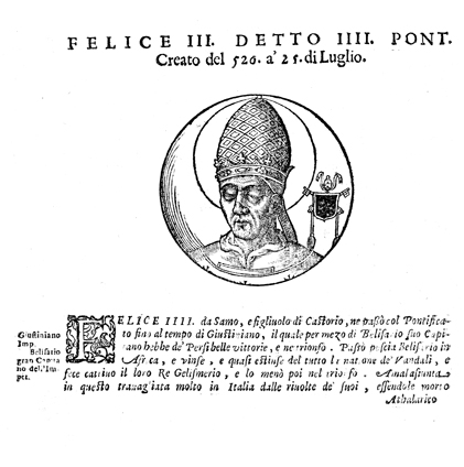 Description: An image of Felix IV, Pope of the Roman Catholic Church and the Bishop of Rome (r. 526-530 CE). He wears a pallium and is depicted with a nimbus; to the right is a blank coat of arms with the papal triple tiara above.