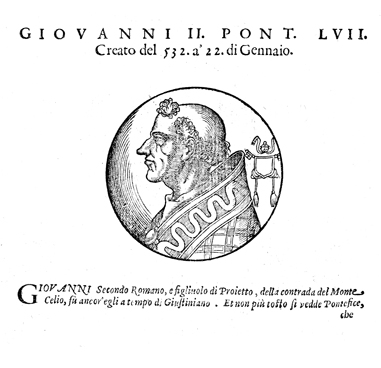 Description: An image of John II, Pope of the Roman Catholic Church and the Bishop of Rome (r. 533-535 CE). He wears a pallium while to the right is a blank coat of arms with the papal triple tiara above.