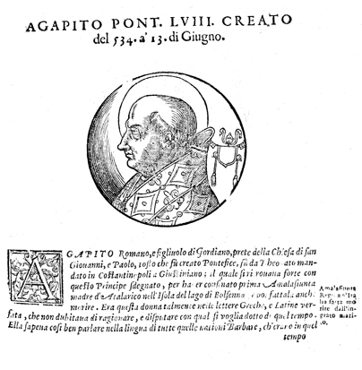 Description: An image of Agapetus I, Pope of the Roman Catholic Church and the Bishop of Rome (r. 535-536 CE). He wears a pallium and is depicted with a nimbus; to the right is a blank coat of arms with the papal triple tiara above.