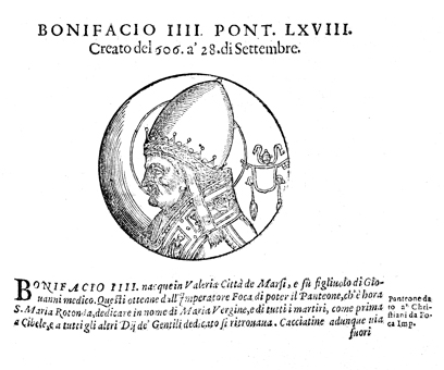Description: An image of Boniface IV, Pope of the Roman Catholic Church and the Bishop of Rome. He wears a pallium and is depicted with a nimbus; to the right is a blank coat of arms with the papal triple tiara above.
