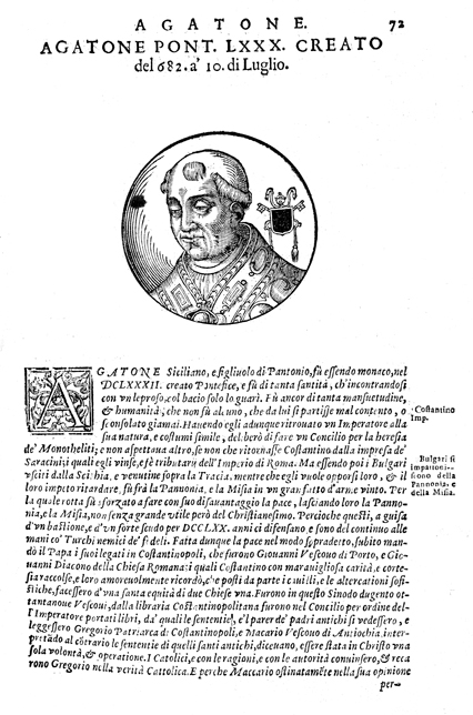 Description: An image of Agatho, Pope of the Roman Catholic Church and the Bishop of Rome (r. 678-681 CE). He wears a pallium and is depicted with a nimbus while to the right is a blank coat of arms with the papal triple tiara above.