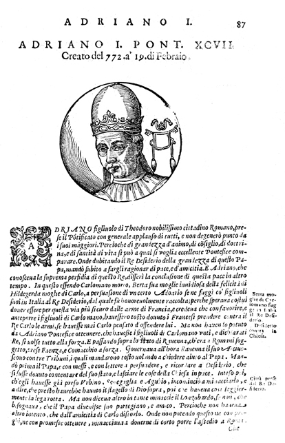 Description: An image of Adrian I, or Hadrian I, Pope of the Roman Catholic Church and the Bishop of Rome (r. 772-795 CE). He wears a pallium while to the right is a blank coat of arms with the papal triple tiara above.