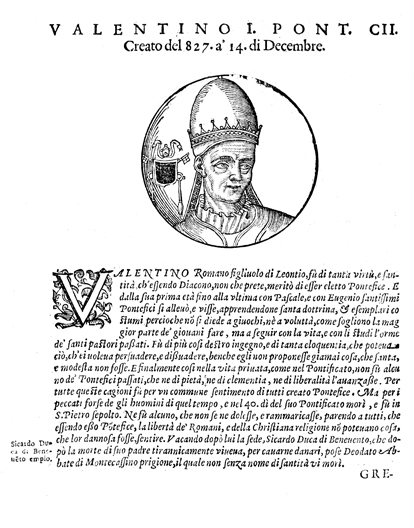 Description: An image of Valentine, Pope of the Roman Catholic Church and the Bishop of Rome (r. 827 CE). He wears a pallium while to the left is a blank coat of arms with the papal triple tiara above.