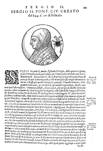 Description: An image of Sergius II, Pope of the Roman Catholic Church and the Bishop of Rome (r. 844-847 CE). He wears a pallium while to the right is a blank coat of arms with the papal triple tiara above.