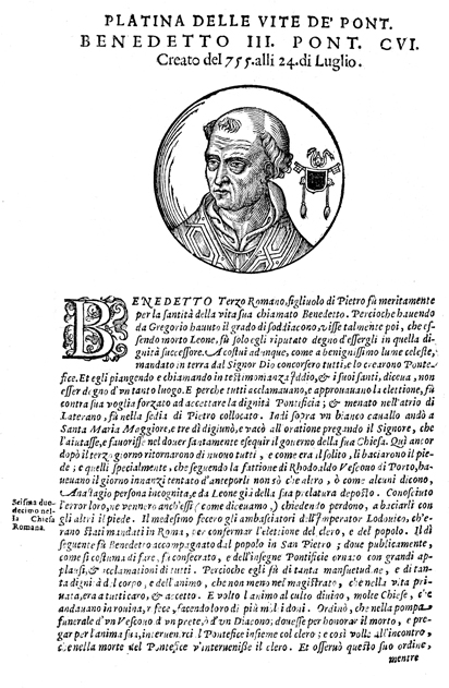 Description: An image of Benedict III, Pope of the Roman Catholic Church and the Bishop of Rome (r. 855-858 CE). He wears a pallium while to the right is a blank coat of arms with the papal triple tiara above.