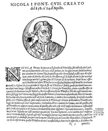 Description: An image of Nicholas I, or Nicholas the Great, Pope of the Roman Catholic Church and the Bishop of Rome (r. 858-867 CE). He wears a pallium while to the left is a blank coat of arms with the papal triple tiara above.