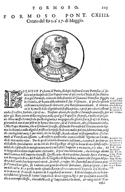 Description: An image of Formosus I, Pope of the Roman Catholic Church and the Bishop of Rome (r. 891-896 CE). He wears a pallium while to the left is a blank coat of arms with the papal triple tiara above.