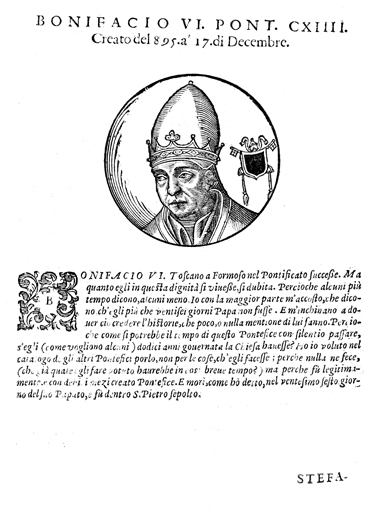 Description: An image of Boniface VI, Pope of the Roman Catholic Church and the Bishop of Rome (r. 896 CE). He wears a pallium while to the right is a blank coat of arms with the papal triple tiara above.
