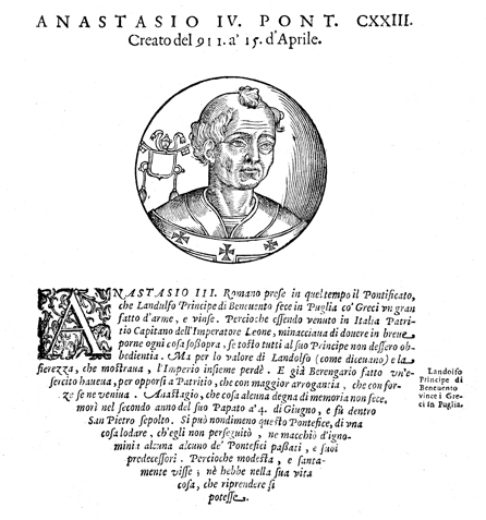 Description: An image of Anastasius III, Pope of the Roman Catholic Church and the Bishop of Rome (r. 911-913 CE). He wears a pallium while to the left is a coat of arms with the papal triple tiara above.