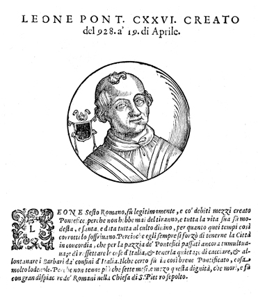 Description: An image of Leo VI, Pope of the Roman Catholic Church and the Bishop of Rome (r. 928 CE). He wears a pallium while to the left is a blank coat of arms with the papal triple tiara above.