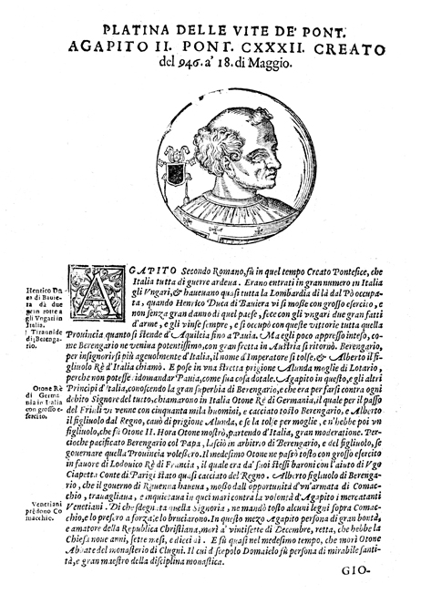 [Historia delle vite de sommi pontefici : dal Salvator Nostro sino a Gregorio XV / Scitta già da Battista Platina Cremonese ; dal P.F. Onofrio Panvinio da Verona, da Antonio Cicarelli da Foligno e da D. Giovanni Stringa Venetiano. Et hora ampliata dal M.R.P.F. Abramo Bzovio, Maestro di Theologia dell'ordine de Predicatori delle vite di Paolo V & di Greg. XV. Illustrata con le Annotationi del Panvinio, nelle vie descritte dal Platina, e con la Cronologia Ecclesiastica dell'istesso, tradotta in lingua Italiana & ampliata dal R.M. Bartolomeo Dionigi da Fano, da D. Lauro Testa, e dal detto P.F. Abramo Bzovio. Ornata nuovamente di bellissimi ritratti di tutti i Pontefici al naturale. Arrichita con'nomi, cognomi, patrie et titoli di tutti quei Cardinali de quali s'è potuto haver cognitione, raccolti per il sudetto Dionigi dall'opere del Panvinio e da gli arti della Cancellaria Apostolica.]