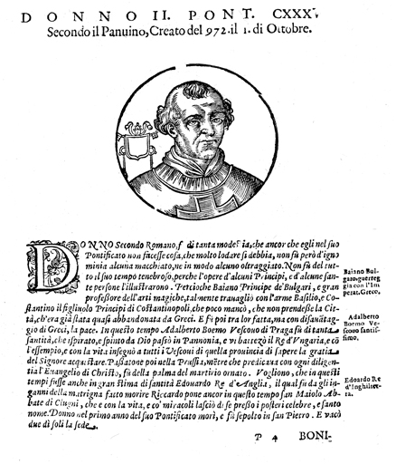 Description: The apocryphal pope Donus II, who was invented when the Latin word ‘domnus’, or ‘dominus’, was misread as a name.