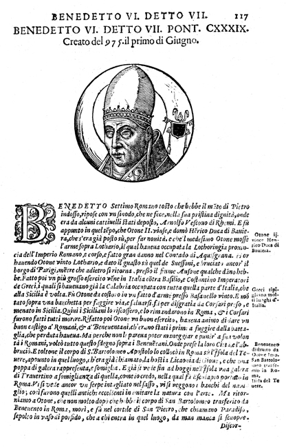 [Historia delle vite de sommi pontefici : dal Salvator Nostro sino a Gregorio XV / Scitta già da Battista Platina Cremonese ; dal P.F. Onofrio Panvinio da Verona, da Antonio Cicarelli da Foligno e da D. Giovanni Stringa Venetiano. Et hora ampliata dal M.R.P.F. Abramo Bzovio, Maestro di Theologia dell'ordine de Predicatori delle vite di Paolo V & di Greg. XV. Illustrata con le Annotationi del Panvinio, nelle vie descritte dal Platina, e con la Cronologia Ecclesiastica dell'istesso, tradotta in lingua Italiana & ampliata dal R.M. Bartolomeo Dionigi da Fano, da D. Lauro Testa, e dal detto P.F. Abramo Bzovio. Ornata nuovamente di bellissimi ritratti di tutti i Pontefici al naturale. Arrichita con'nomi, cognomi, patrie et titoli di tutti quei Cardinali de quali s'è potuto haver cognitione, raccolti per il sudetto Dionigi dall'opere del Panvinio e da gli arti della Cancellaria Apostolica.]