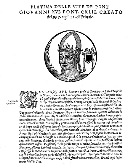 Description: An image of John XVI, Antipope of the Roman Catholic Church (r. 997-998 CE). He wears a pallium while to the right is a blank coat of arms with the papal triple tiara above.