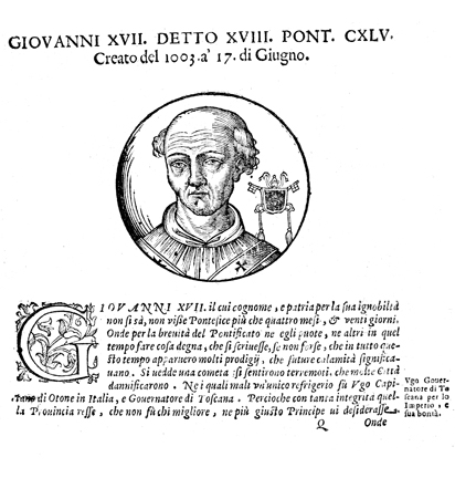 Description: An image of John XVII, Pope of the Roman Catholic Church (r. 1003 CE). He wears a pallium while to the right is a blank coat of arms with the papal triple tiara above.