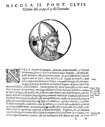 Description: An image of Nicholas II, Pope of the Roman Catholic Church (r. 1059-1061 CE). He wears a pallium while to the left is Nicholas’ coat of arms with the papal triple tiara above.