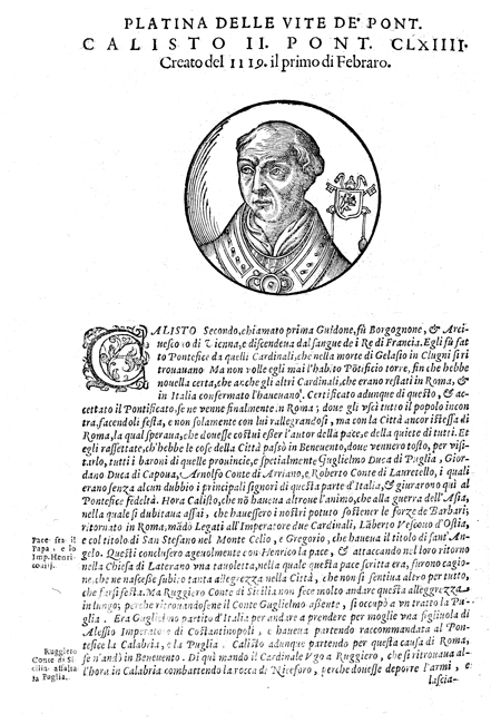 Description: An image of Callixtus II, or Calistus II, Pope of the Roman Catholic Church (r. 1119-1124 CE). He wears a pallium while to the right is Callixtus’coat of arms with the papal triple tiara above.