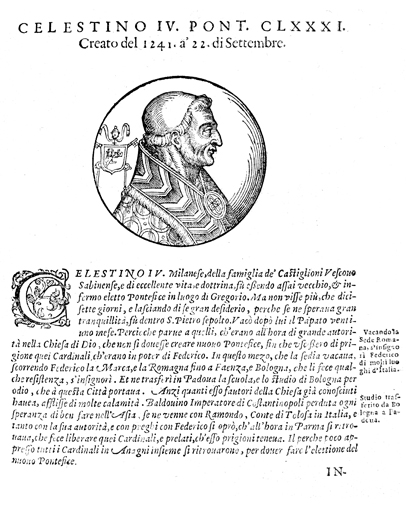 Description: An image of Celestine IV, Pope of the Roman Catholic Church and the Bishop of Rome (r. 1241 CE). He wears a pallium while to the left is Celestine’s coat of arms with the papal triple tiara above.