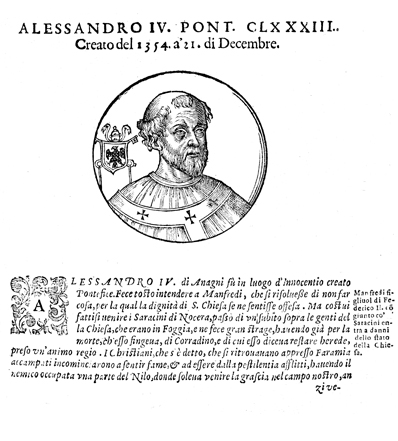 Description: An image of Alexander IV, Pope of the Roman Catholic Church and the Bishop of Rome (r. 1254-1261 CE). He wears a pallium while to the left is Alexander’s coat of arms with the papal triple tiara above.