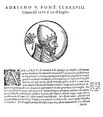 Description: An image of Adrian V, or Hadrian V, Pope of the Roman Catholic Church (r. 1276 CE). He wears a pallium while to the left is Adrian’s coat of arms with the papal triple tiara above.