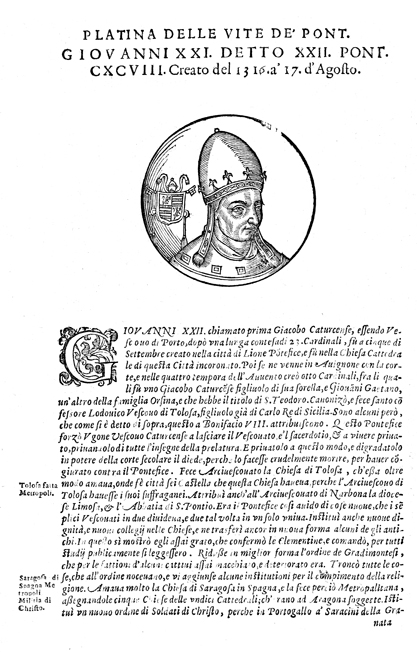 [Historia delle vite de sommi pontefici : dal Salvator Nostro sino a Gregorio XV / Scitta già da Battista Platina Cremonese ; dal P.F. Onofrio Panvinio da Verona, da Antonio Cicarelli da Foligno e da D. Giovanni Stringa Venetiano. Et hora ampliata dal M.R.P.F. Abramo Bzovio, Maestro di Theologia dell'ordine de Predicatori delle vite di Paolo V & di Greg. XV. Illustrata con le Annotationi del Panvinio, nelle vie descritte dal Platina, e con la Cronologia Ecclesiastica dell'istesso, tradotta in lingua Italiana & ampliata dal R.M. Bartolomeo Dionigi da Fano, da D. Lauro Testa, e dal detto P.F. Abramo Bzovio. Ornata nuovamente di bellissimi ritratti di tutti i Pontefici al naturale. Arrichita con'nomi, cognomi, patrie et titoli di tutti quei Cardinali de quali s'è potuto haver cognitione, raccolti per il sudetto Dionigi dall'opere del Panvinio e da gli arti della Cancellaria Apostolica.]